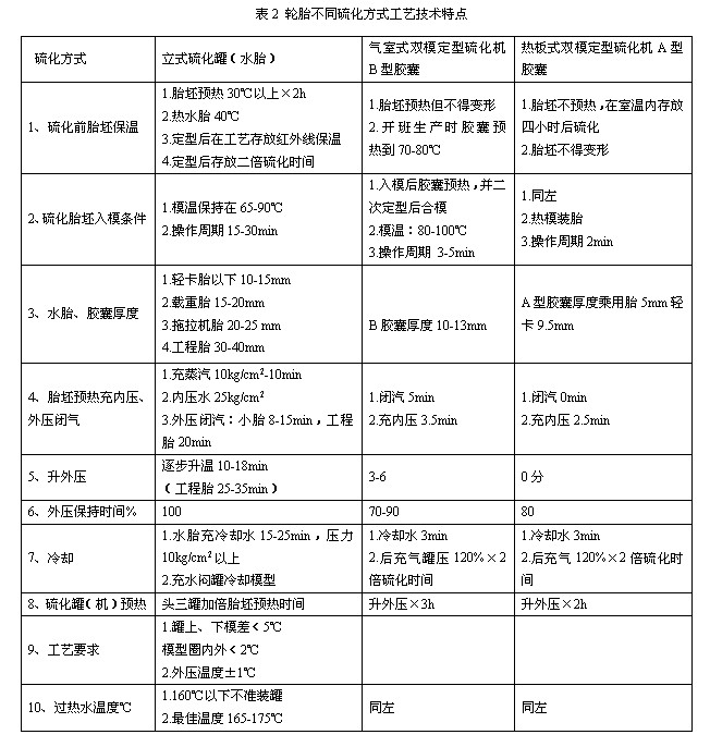 隨我國橡膠工業的發展,外胎硫化中,小型輪胎逐步實現“以機代罐”,與罐硫化工藝特點有很大區別(表2)。汽車工業飛速發展,現代工程輪胎出現巨型_厚型輪胎,例如:30-51巨型工程胎胎肩厚度達到約20厘米,輪胎重量1500kg,要求準確測算出外胎正硫化時間,對試驗設計階段的產品,有很大的實際意義。下面介紹:運用級量法測算輪胎正硫化時間的方法。
