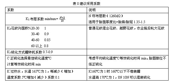用級量法評估計算外胎硫化條件。輕卡胎、載重胎(表6),工程胎、農業胎(表7)外胎硫化條件誤差率多數5%以下,證明方法基本可行。建議采用系數(表8)。
